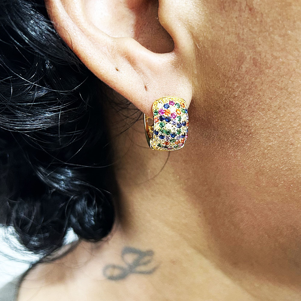 Argolinha Micro Cravejada 13x9mm 7 Fileiras de Zircônia Colorida Banhado à Ouro , com banho de 5 milésimos. Nossas peças passam por um processo de acabamento manual que proporciona brilho espelhado em nosso banho garantindo qualidade premium em nossos produtos. Damos garantia de 2 anos em nossas joias após o recebimento.