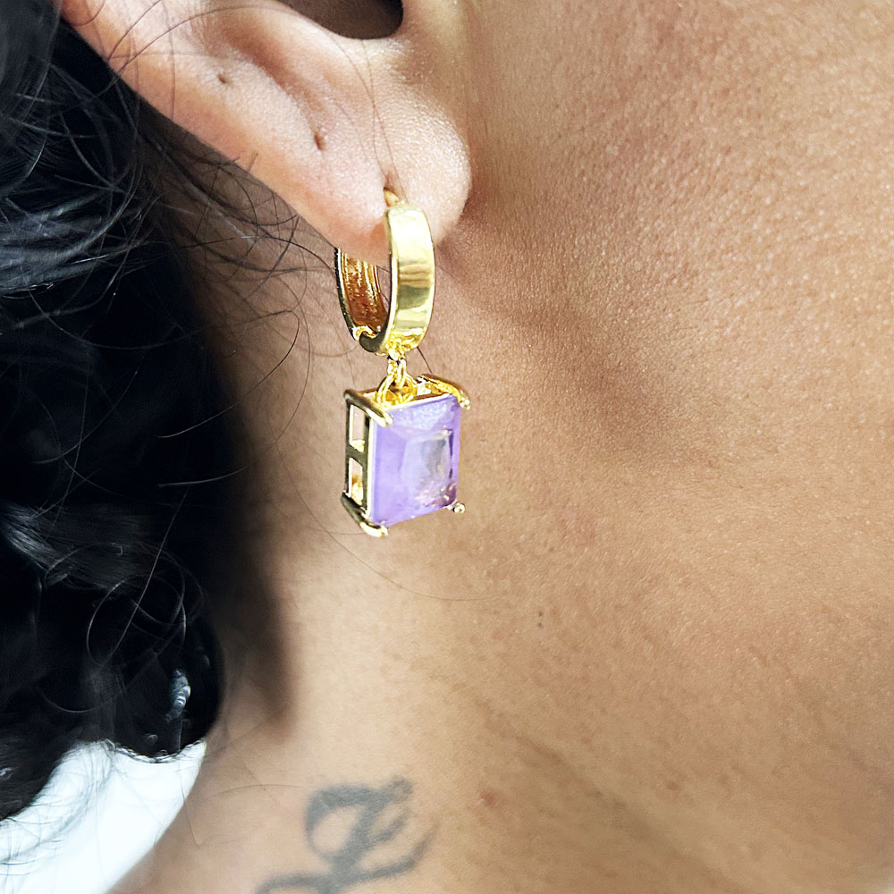Brinco Argola Click Pingente Fusion Natural Lavanda Banhado à Ouro, com banho de 5 milésimos. Nossas peças passam por um processo de acabamento manual que proporciona brilho espelhado em nosso banho garantindo qualidade premium em nossos produtos. Damos garantia de 2 anos em nossas joias após o recebimento.
