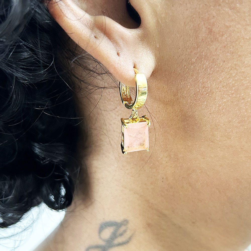 Brinco Argola Click Pingente Fusion Natural Rosa Banhado à Ouro
