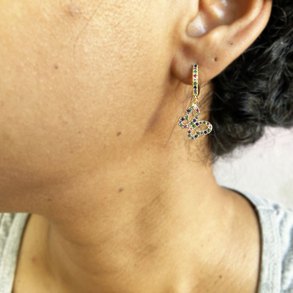 Brinco Argolinha Cravejada Colorida Pingente de Borboleta Banhado à Ouro, com banho de 5 milésimos. Nossas peças passam por um processo de acabamento manual que proporciona brilho espelhado em nosso banho garantindo qualidade premium em nossos produtos. Damos garantia de 2 anos em nossas joias após o recebimento.