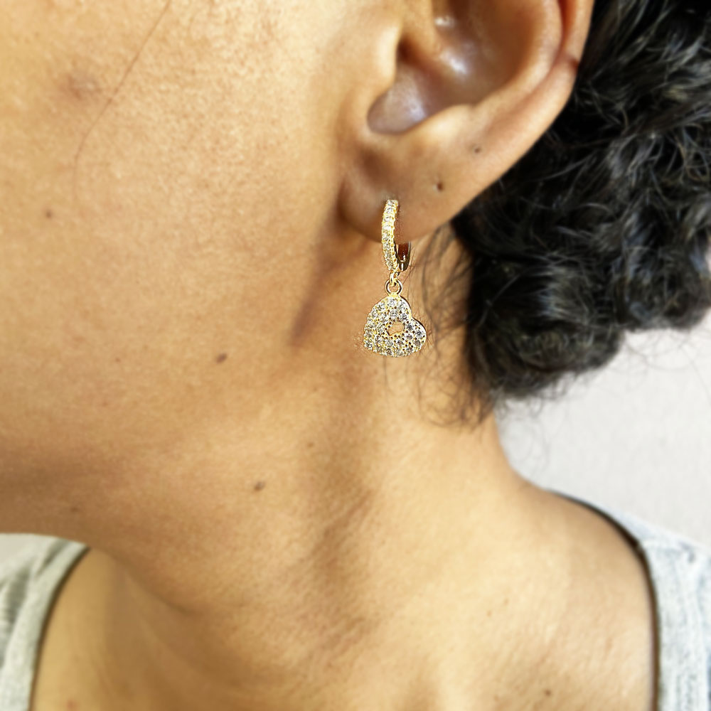 Brinco de Argolinha Cravejada Cristal Pingente de Coração Banhado à Ouro, com banho de 5 milésimos. Nossas peças passam por um processo de acabamento manual que proporciona brilho espelhado em nosso banho garantindo qualidade premium em nossos produtos. Damos garantia de 2 anos em nossas joias após o recebimento.