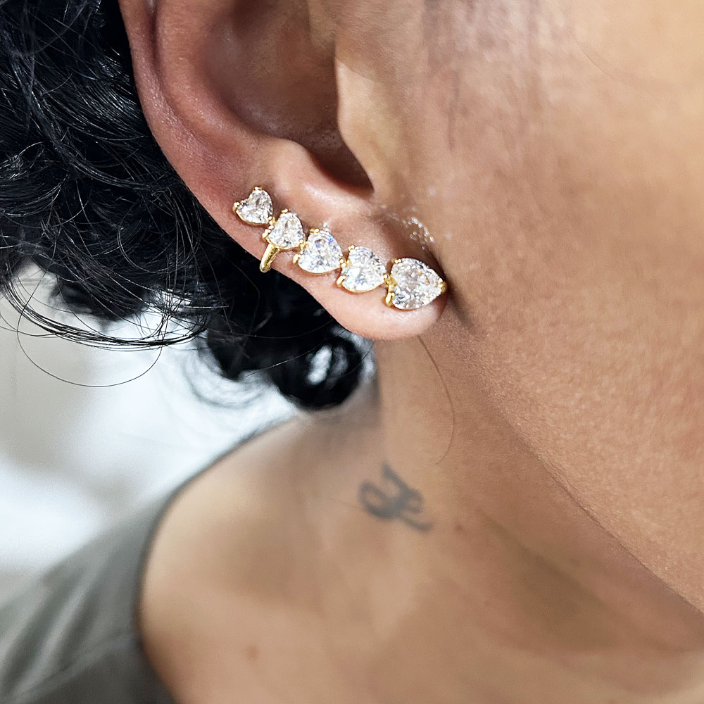 Brinco Earcuff Corações de Zircônia Cristal Banhado à Ouro, com banho de 5 milésimos. Nossas peças passam por um processo de acabamento manual que proporciona brilho espelhado em nosso banho garantindo qualidade premium em nossos produtos. Damos garantia de 2 anos em nossas joias após o recebimento.