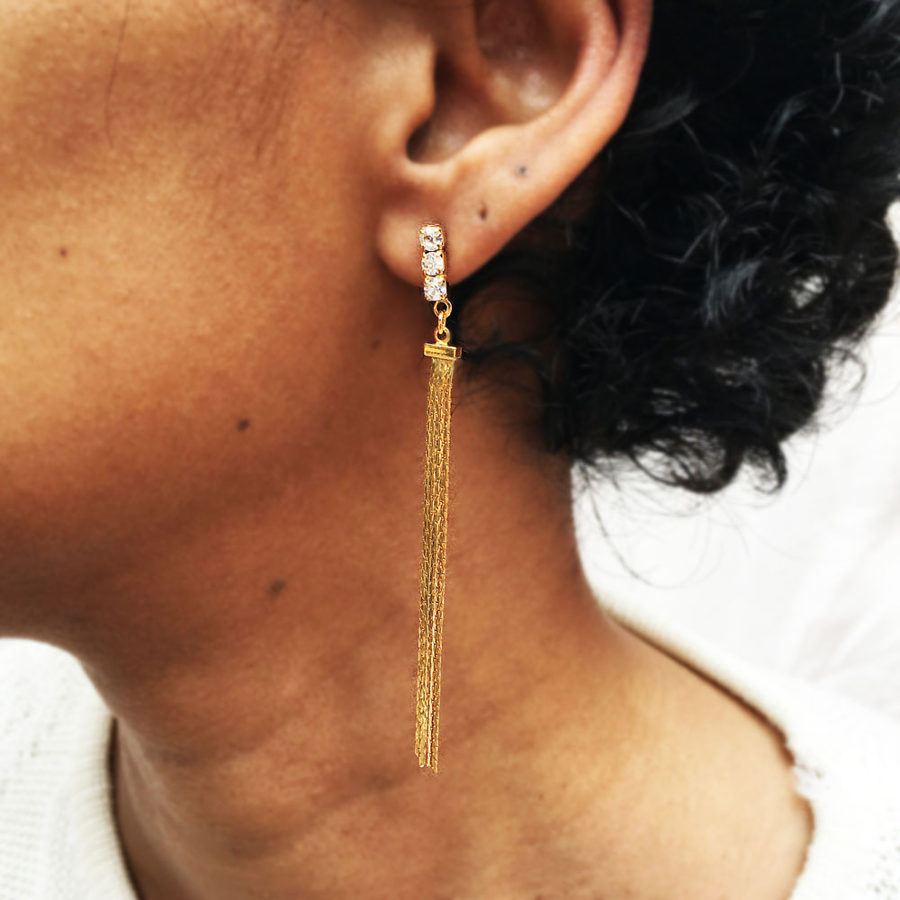 Brinco Franja e Cristais Banhado à Ouro, com banho de 5 milésimos. Nossas peças passam por um processo de acabamento manual que proporciona brilho espelhado em nosso banho garantindo qualidade premium em nossos produtos. Damos garantia de 1 ano em nossas joias após o recebimento.