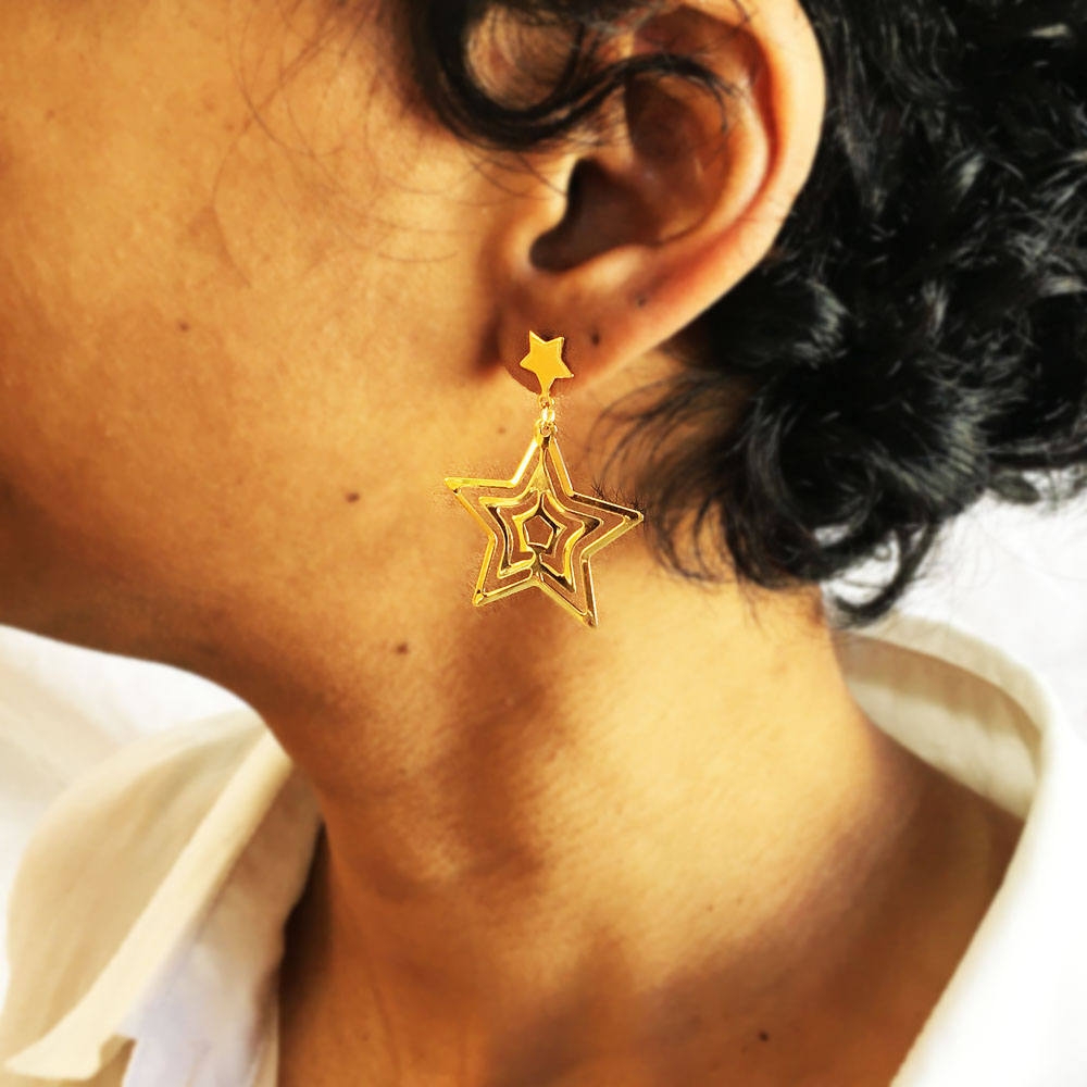 Brinco Médio Formato Estrela Banhado à Ouro, com banho de 5 milésimos. Nossas peças passam por um processo de acabamento manual que proporciona brilho espelhado em nosso banho garantindo qualidade premium em nossos produtos. Damos garantia de 1 ano em nossas joias após o recebimento.