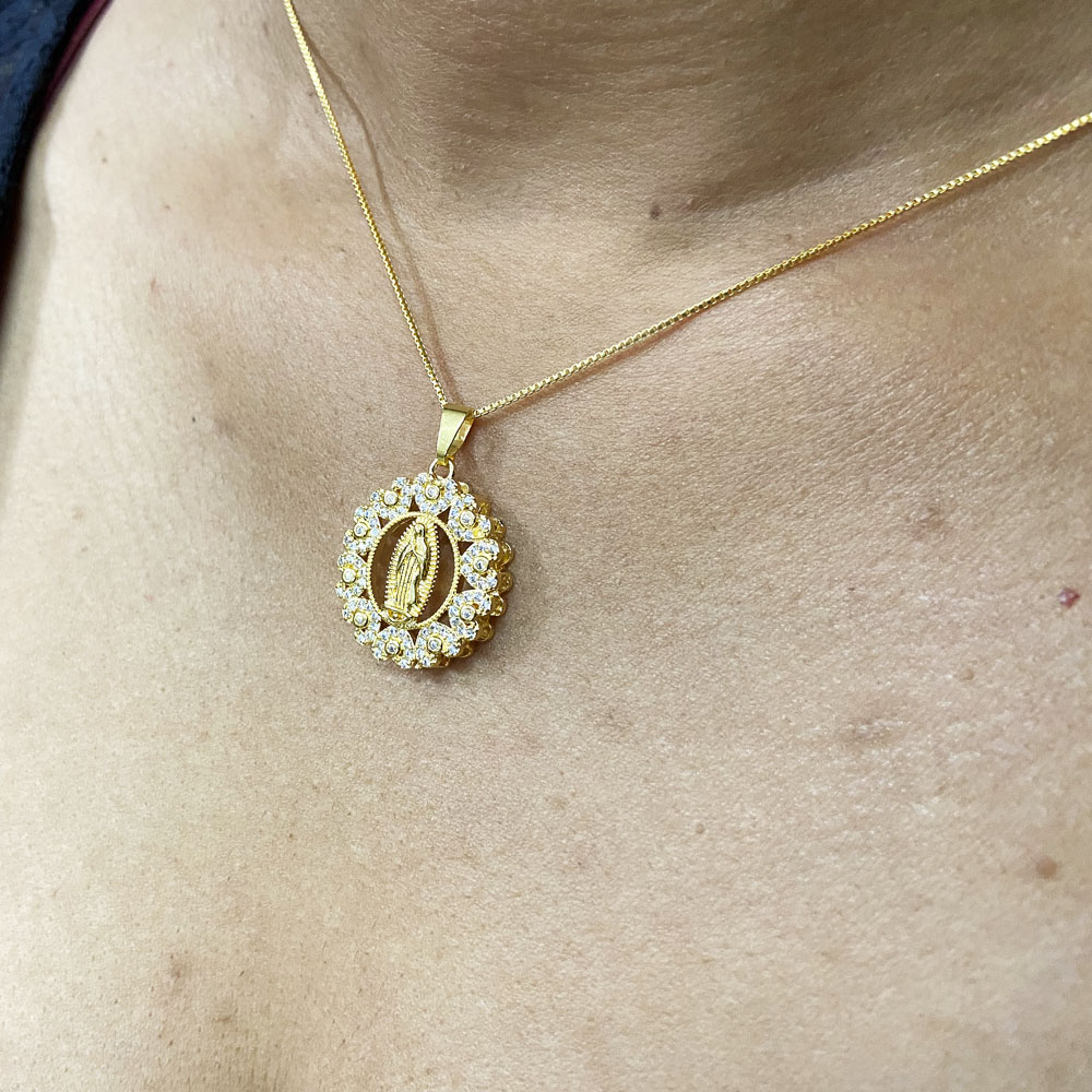 Colar Nossa Senhora de Guadalupe em Zircônia Cristal Banhado à Ouro, com banho de 10 milésimos. Nossas peças passam por um processo de acabamento manual que proporciona brilho espelhado em nosso banho garantindo qualidade e excelência premium em nossos produtos. Damos garantia de 2 anos em nossas joias após o recebimento.