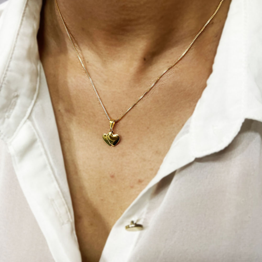 Pingente 2 Corações 9mm Banhado à Ouro, com banho de 5 milésimos. Nossas peças passam por um processo de acabamento manual que proporciona brilho espelhado em nosso banho garantindo qualidade premium em nossos produtos. Damos garantia de 2 anos em nossas joias após o recebimento.