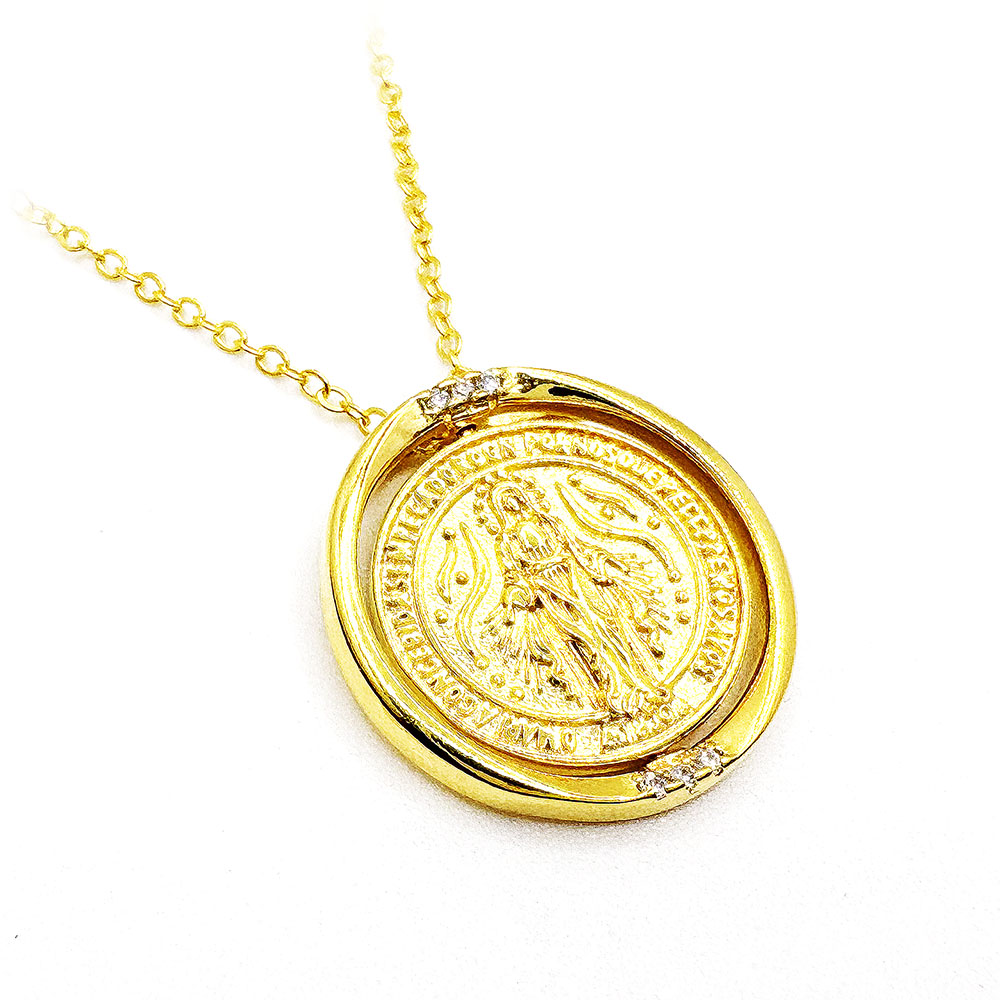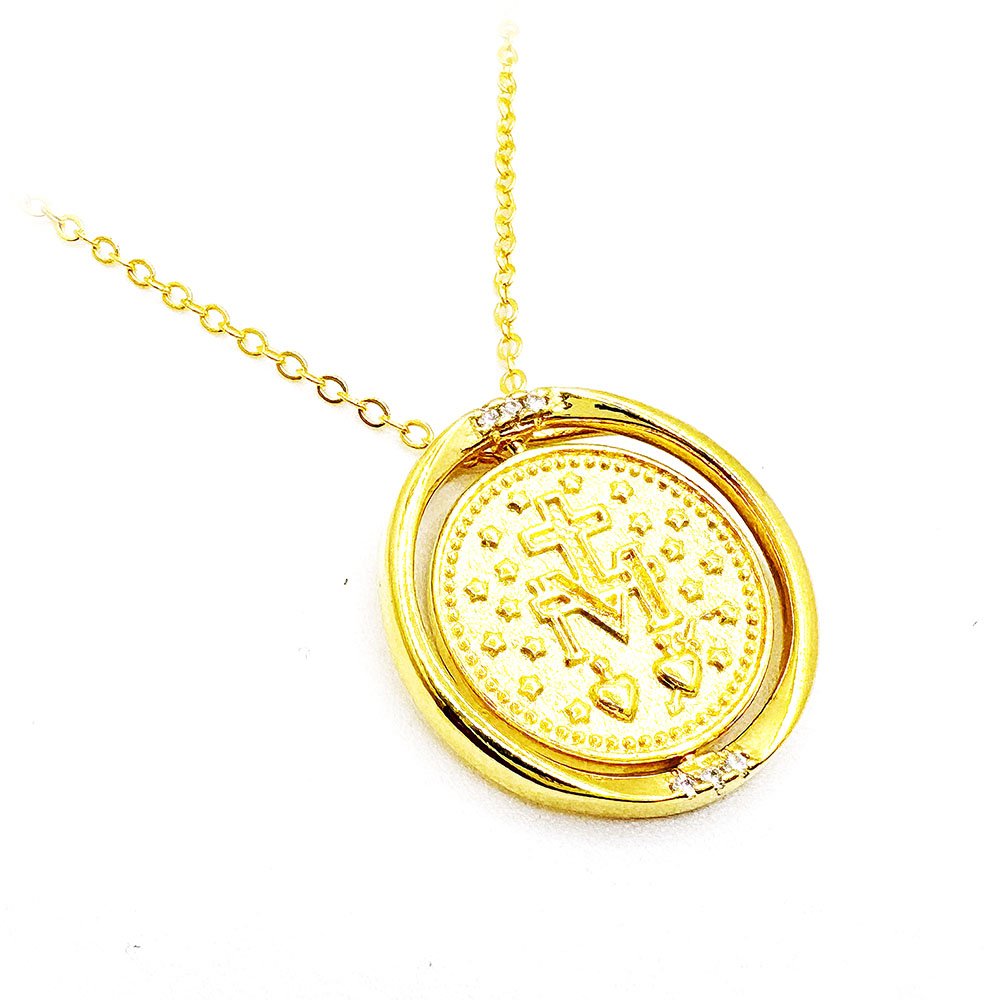 Pingente Nsa Senhora das Graças 20mm Frente Verso Borda Micro Cravejada em Zircônias Cristal Banhado à Ouro , com banho de 7 milésimos. Nossas peças passam por um processo de acabamento manual que proporciona brilho espelhado em nosso banho garantindo qualidade premium em nossos produtos. Damos garantia de 2 anos em nossas joias após o recebimento.