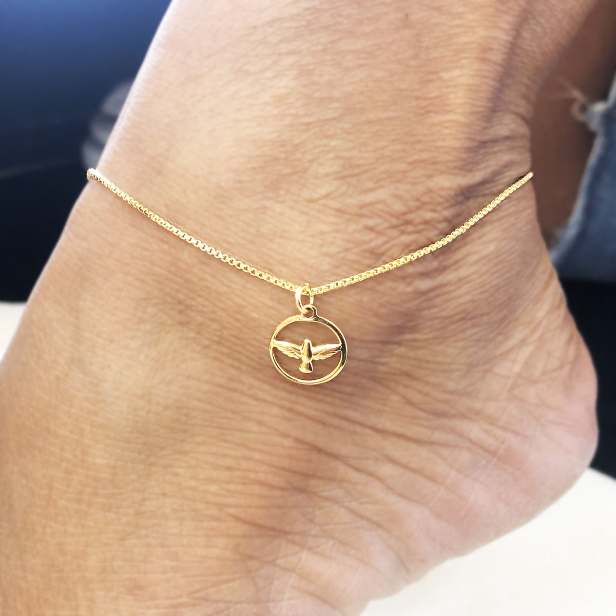 Tornozeleira Elos Cadeado Pingente Pomba da Paz Banhada à Ouro, com banho de 10 milésimos. Nossas peças passam por um processo de acabamento manual que proporciona brilho espelhado em nosso banho garantindo qualidade e excelência premium em nossos produtos. Damos garantia de2 anos em nossas joias após o recebimento.